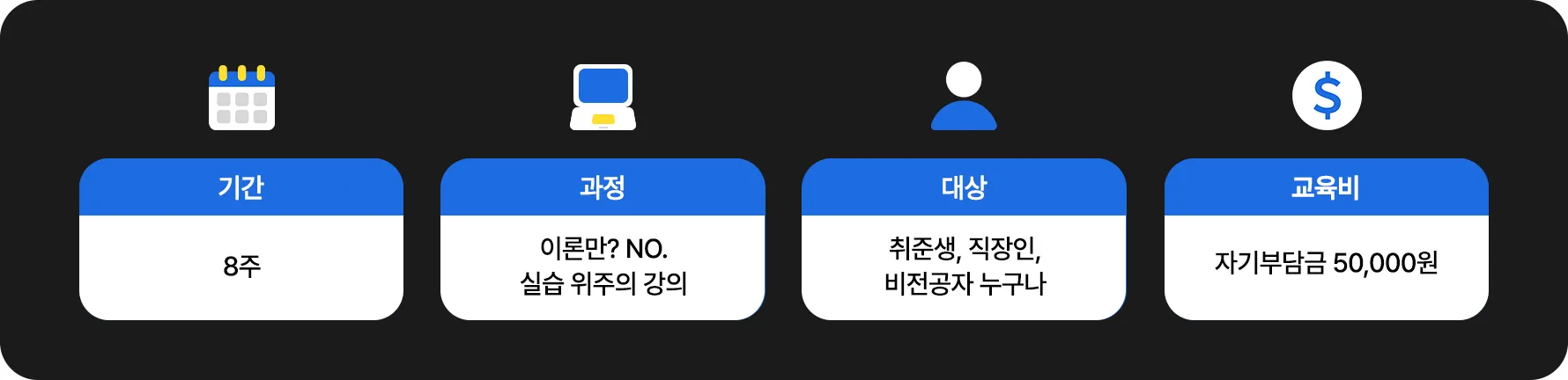 2개월 동안 웹 프로그래밍의 기초부터 프로젝트까지 학습합니다. 코딩 초보자도 결과물을 가져갈 수 있도록 8주 완성 커리큘럼으로 구성되어 있습니다.