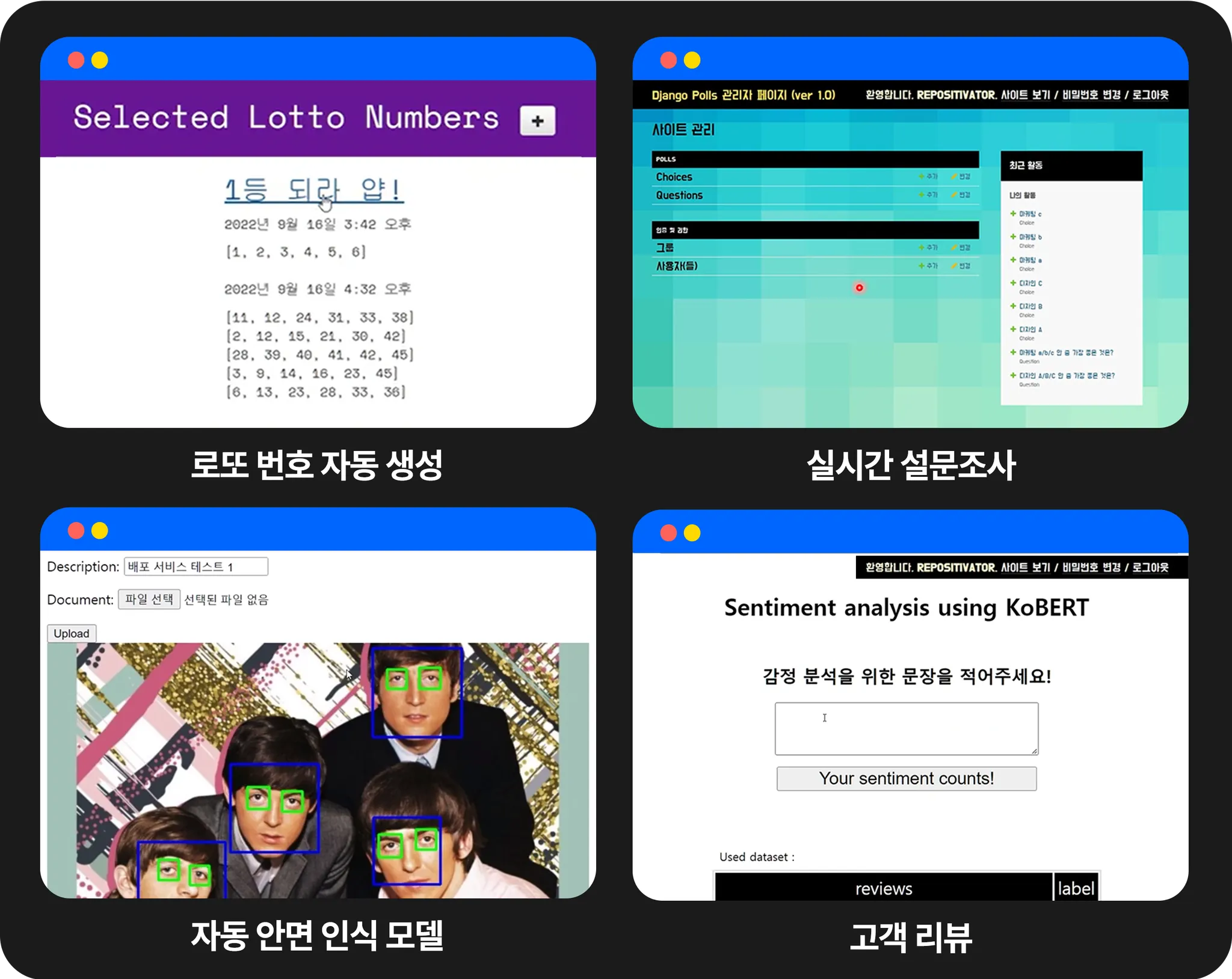 로또 번호 자동 생성 서비스, 실시간 설문 조사 서비스와 함께 예측모델 기반의 자동 안면 인식 서비스, 고객 리뷰 분석까지 가능한 서비스를 만들 수 있습니다.
