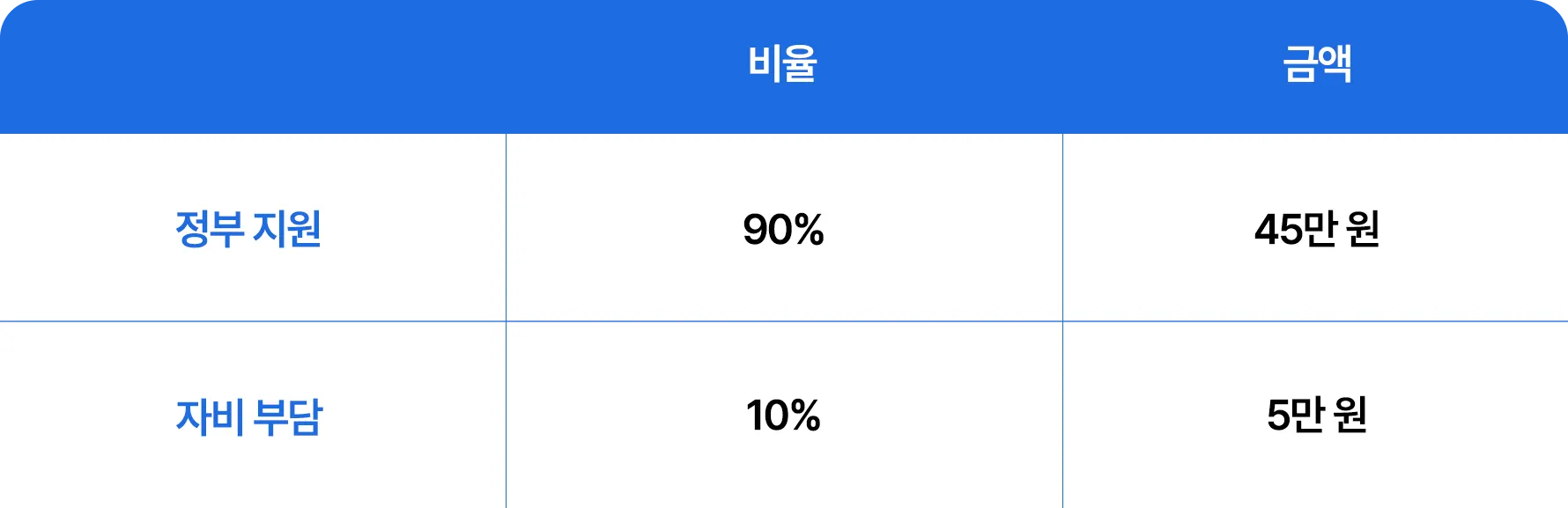 전체 수강료 50만원 중 90% 정부 지원 혜택을 받을 수 있습니다.